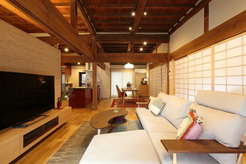 建物種別 一戸建て リフォーム箇所 全面、キッチン、浴室、洗面化粧室、トイレ、リビング・ダイニング、寝室・居室、玄関、外壁・門まわり 工期 7か月 実家の古民家を子世帯が新しい住まいへリノベーションしました。モダンと古民家の木材を活かした空間へ