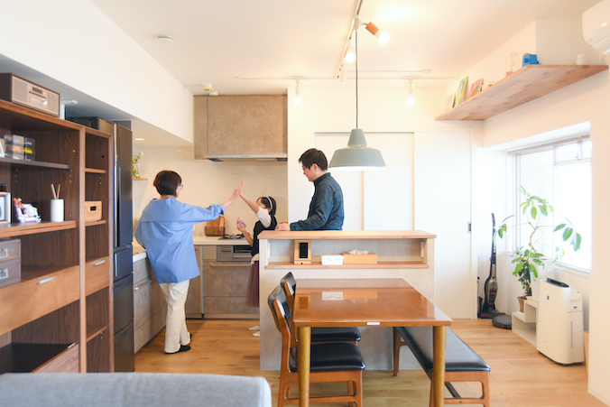 建物種別 マンション リフォーム箇所 全面、キッチン、洗面化粧室、トイレ、リビング・ダイニング、寝室・居室、玄関、その他 リフォーム価格 1200万円 工期 82日 スケルトンリフォーム。ご家族が帰省時も集まれる空間ができ、水廻りも広く使いやすい動線になりました。キッチンから、明るくなったLDKやお孫さんの様子も見渡せます。