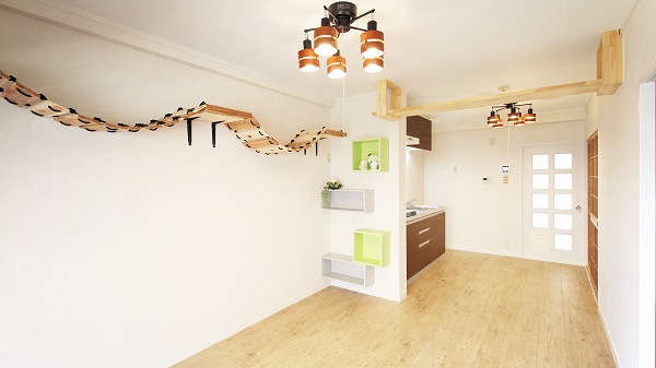 建物種別 マンション リフォーム箇所 全面、キッチン、浴室、洗面化粧室、トイレ、リビング・ダイニング、寝室・居室、玄関 ネコも人も幸せ『猫共生生活』。キャットステップ + キャットウォーク + 猫はしごを設置し、猫の運動不足解消にもなる間取りになるよう工夫を凝らしました。