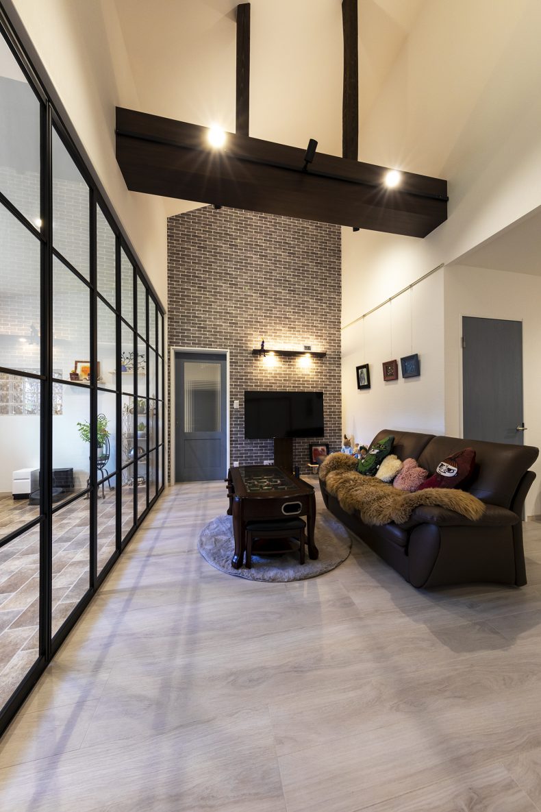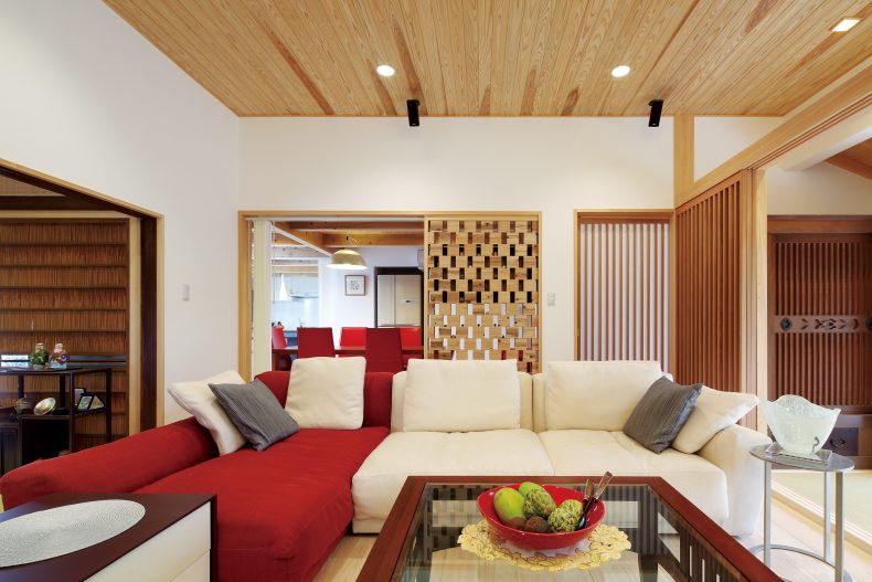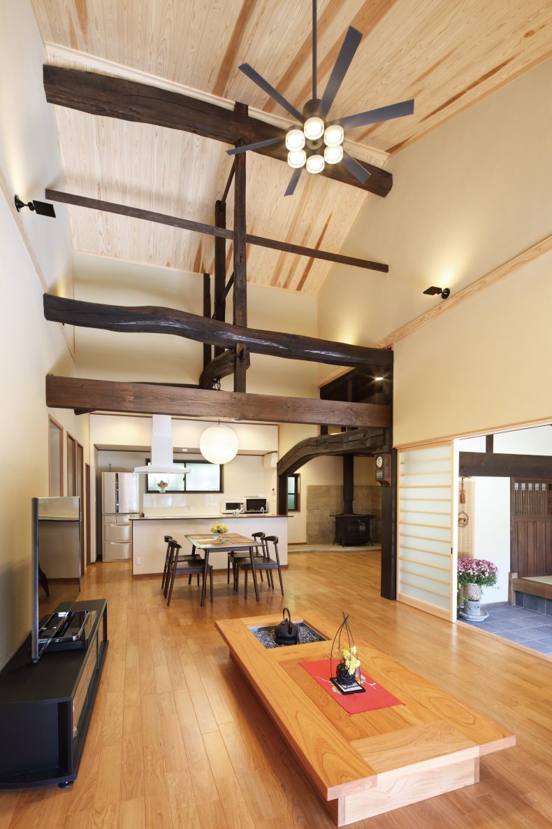 震災で傾いた古民家を耐震・制震補強し再生しました。既存の和室を繋げて家族が集えるひろいLDKへリノベーション。