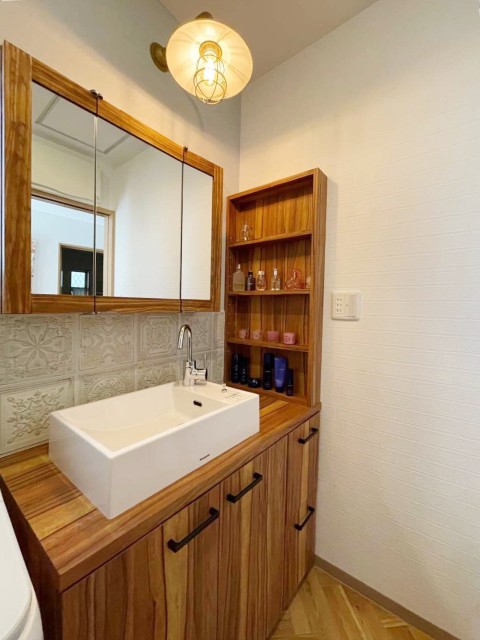建物種別 一戸建て リフォーム箇所 洗面化粧室 リフォーム価格 49万円 工期 3日間 カウンター間口やボウルの位置、キャビネットの厚みや高さ、引出しの寸法まで詳細なお打合せを何度も重ねプランニング。世界にたったひとつのオーダー洗面台。