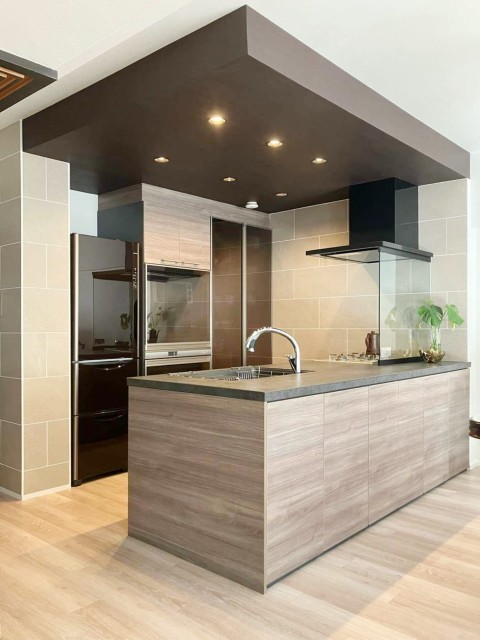 建物種別 マンション リフォーム箇所 キッチン リフォーム価格 330万円 工期 7日間 キッチンが主役の空間になるよう、下り天井のアクセントクロスとダウンライト、壁面のタイルがキッチンを引き立てつつも全体と調和するコーディネート。