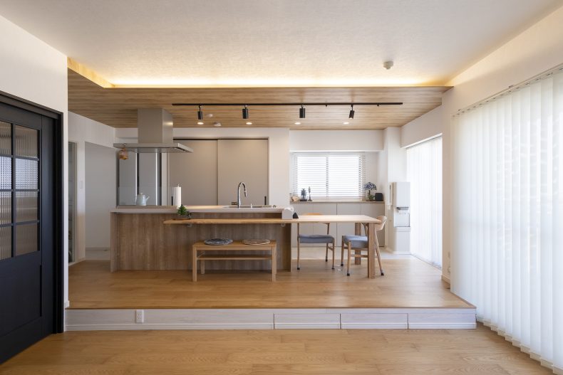 建物種別 マンション リフォーム箇所 全面、キッチン、浴室、洗面化粧室、トイレ、リビング・ダイニング、寝室・居室、玄関 横並びのキッチンで配膳が片付けも楽々。ダイニングテーブルは造作でキッチンに据付けました。キッチンの段差部分には引き出しスペースを設計しました。
