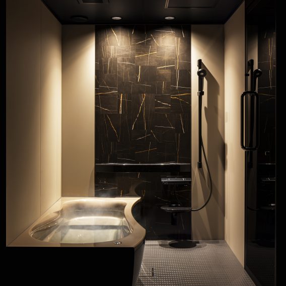 日常の疲れを解放し、心と身体をリセット。広がりを感じながらほっと一息つく時間。心地よい素材に彩られた場所。泡と音にほどけてゆく感覚。ニュートラルな自分に戻るバスルームです。