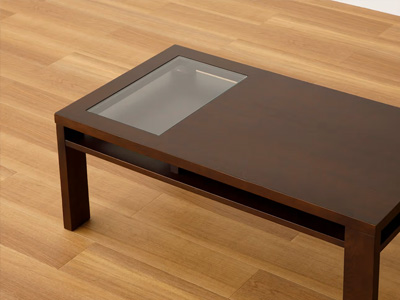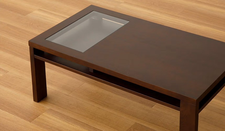 ソファと同素材のグレーのヒヤシンスとガラスの組み合わせが、落ち着きを感じさせるローテーブル